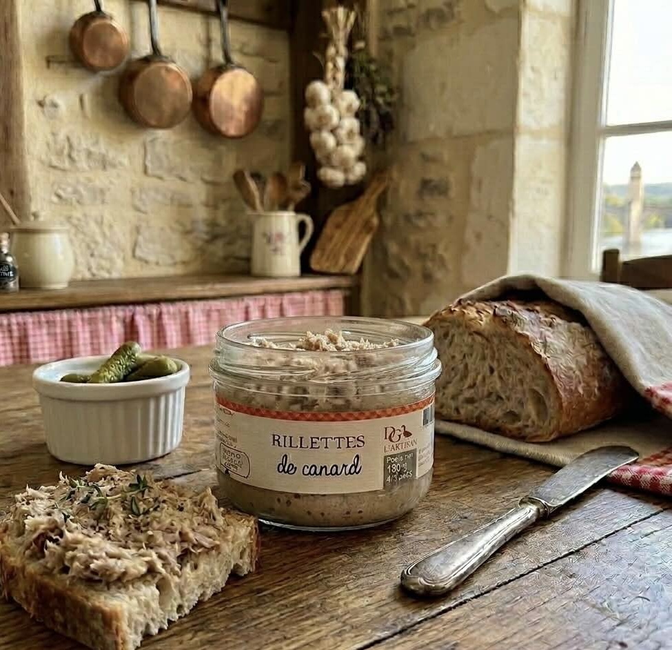 Das herzhafte Enten-Rillettes ist eingelegtes Entenfleisch, das im eigenen Fett und Saft gekocht und haltbar gemacht wird. Es sind zarte und streichfähige Fleischstreifen. Darin ist ausschließlich Entenfleisch aus Frankreich enthalten (ohne Schweinefleisch).
