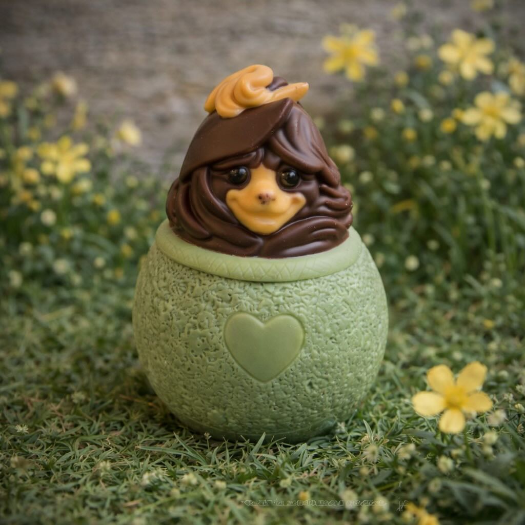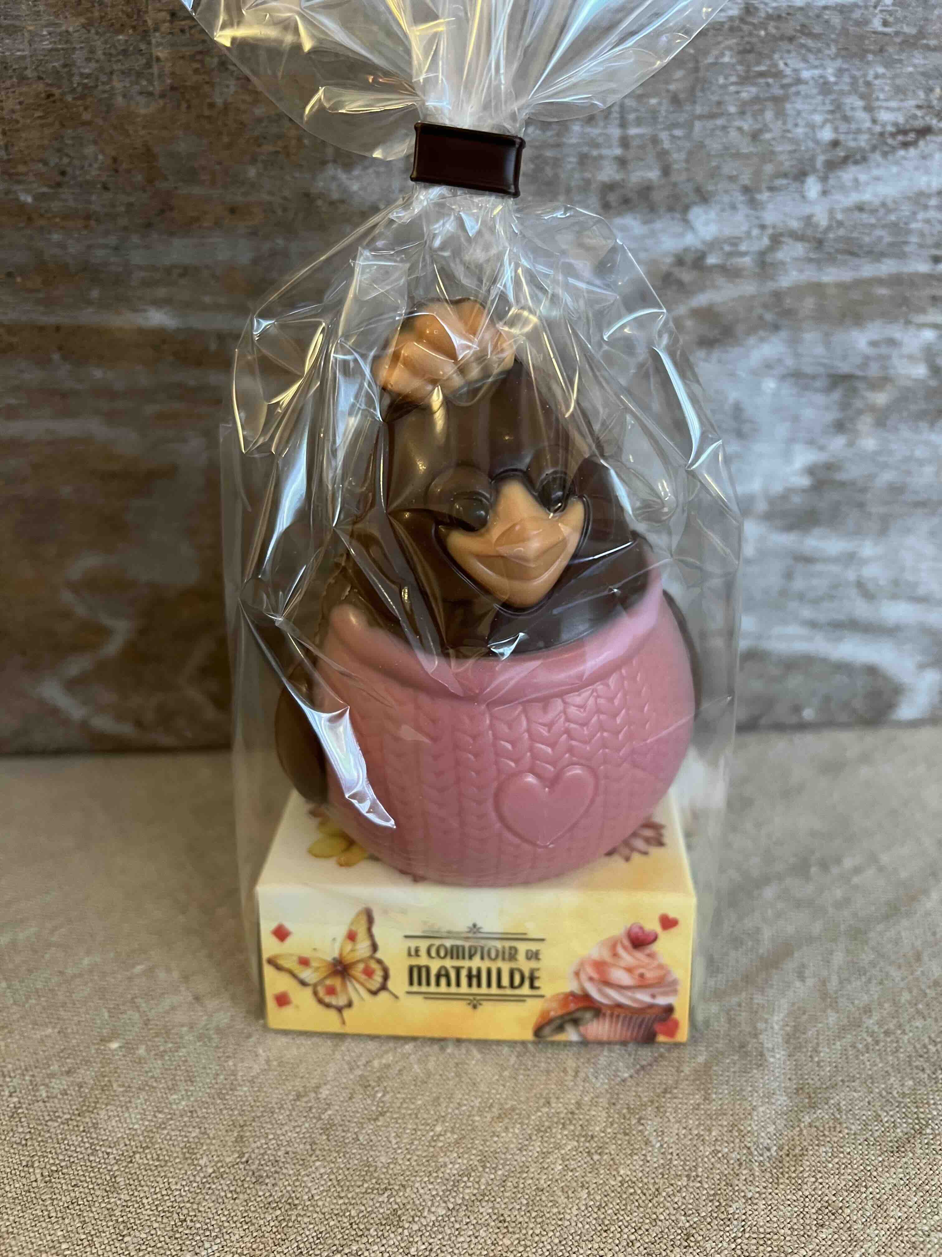 Zur Osterfarm gehören die Küken mit Pullis in unterschiedlichen Farben (rosa oder grün). Das Küken “Poussin” ist aus einer leckeren Milchschokolade und entstand aus einer Gussform.